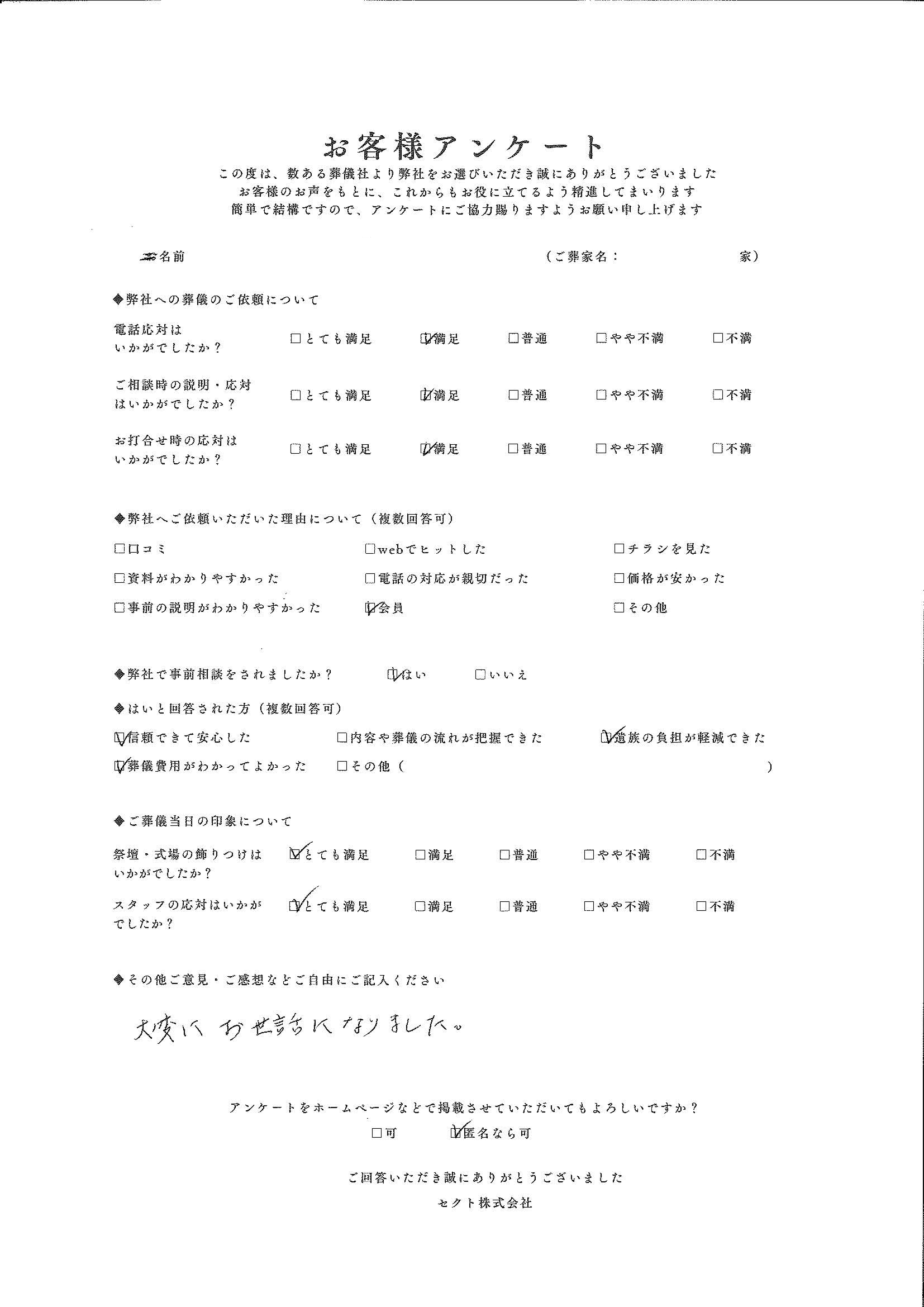 セクトでは、葬儀を終えられたご遺族の方にアンケートにご協力いただき、より良いサービスの提供に努めております。