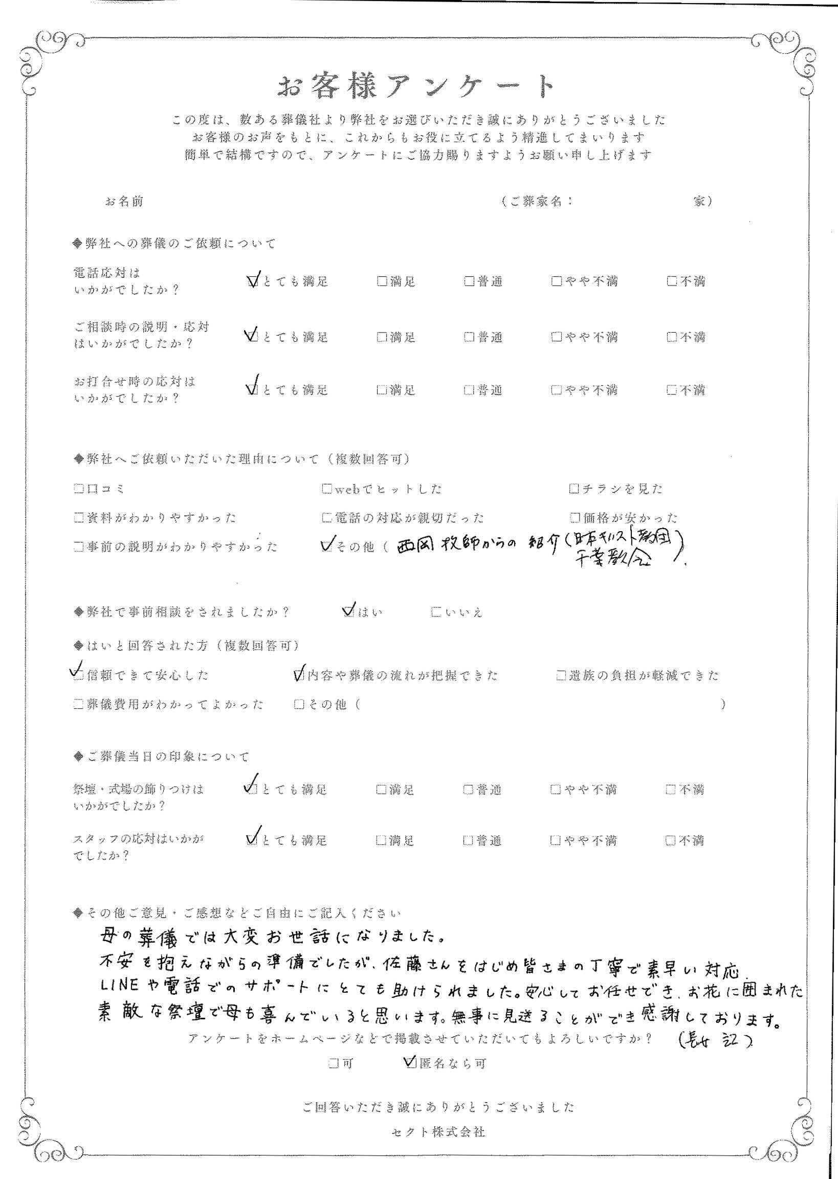 ご不安の多い中でのご準備だったかと存じますが、担当の佐藤をはじめ、スタッフの対応やLINE・お電話でのサポートがお力になれたとのこと、大変嬉しく思っております。大切なお母様のお見送りをお手伝いできましたこと、心より光栄に存じます。