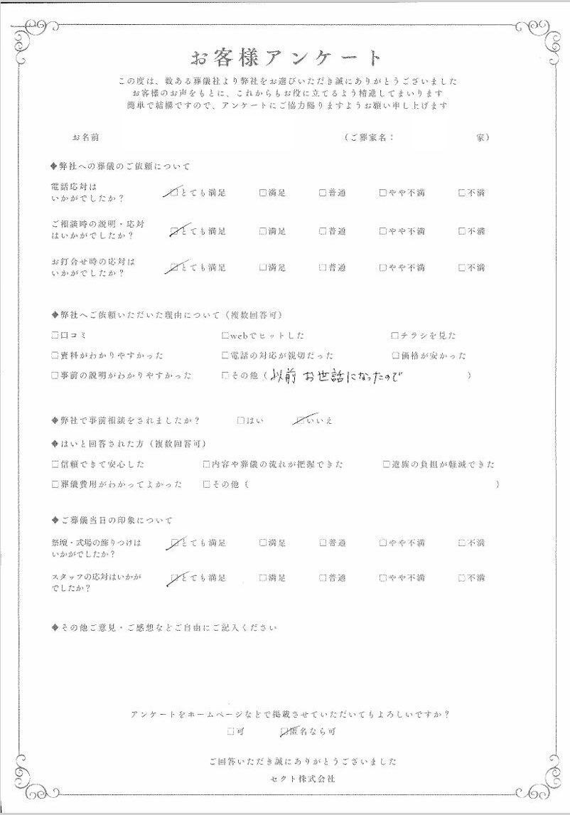 セクトでは、葬儀を終えられたご遺族の方にアンケートにご協力いただき、より良いサービスの提供に努めております。